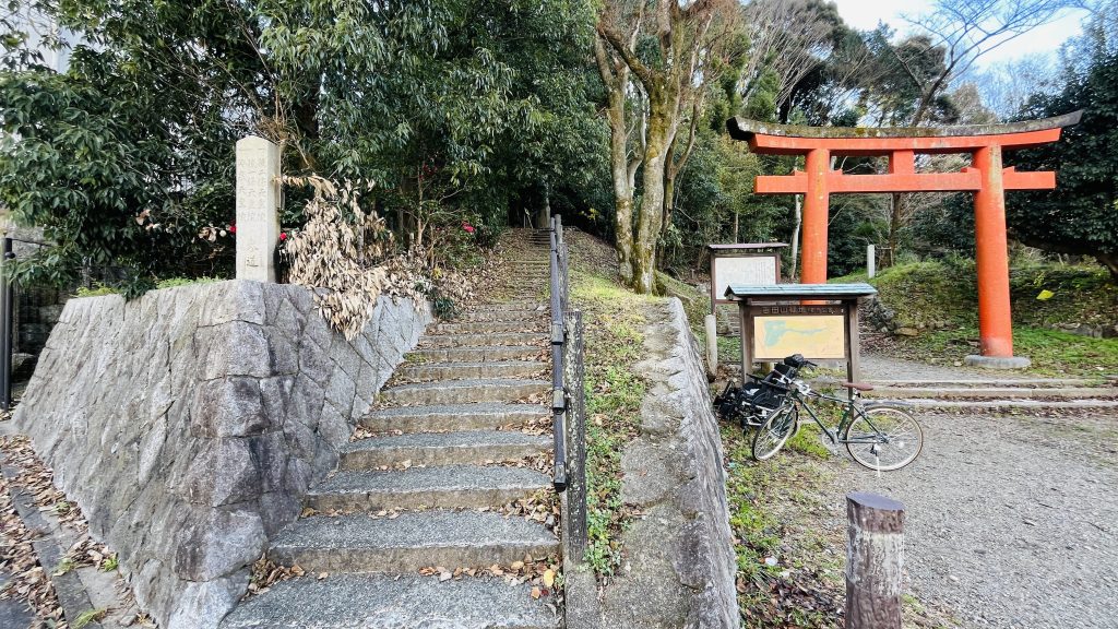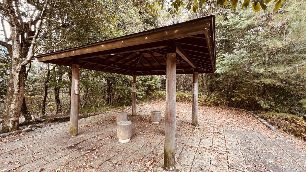 屋根と3つのいすのある休憩所が迎えてくれます。「ここで、京都が見渡せる眺望が!」とか、高望みはNGです。